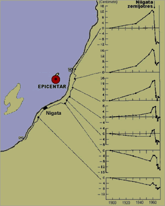 Dijagrami na desnoj strani slike prikazuju izdizanje i spuštanje tla izraženo u centimetrima na različitim tačkama osmatranog dijela obale. U vrhu slike iznad prvog dijagrama strelicom je indiciran momenat pojave razornog zemljotresa u blizini grada Nigita. Epicentar zemljotresa je prikazan crvenim krugom na slici. Većina prikazanih dijagrama jasno izražava trend laganog izdizanja tla do pojave zemljotresa, a zatim efekat naglog relaksiranja stijenskih masa.