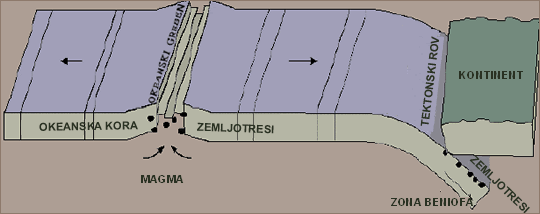 Zbog "konzumiranja" dijela zemljine kore koja u subdukcionom procesu ponire u zemljinu unutrašnjost, na suprotnoj strani tog segmenta aktivan je suprotni proces - razmicanje okeanskog dna i rađanje novog segmenta zemljine kore. I ovaj proces je praćen zemljotresima, a evidentiran je širom Zemlje, posebno u cirkumpacifičkom pojasu (Tihi Okean) i duž cijelog središneg dijela Atlantskog Okeana.