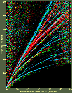 Slika predstavlja kompozitnu ilustraciju ponašanja seizmičkih talasa u Zemljinoj unutrašnjosti, koja je nastala prikupljanjem nekoliko hiljada seizmograma snimljenih putem Globalne seizmološke mreze (Peter Shearer, San Diego). Zahvaljujući kvalitetnom prezentovanju promjena brzina seizmičkih talasa, moguće je definisati parametre jednog reprezentativnog modela građe Zemljine unutrašnjosti. Dosadašnja proučavanja unutrašnjosti Zemlje ukazuju da raspodjela materijala različite gustine, pri čemu se gustina povećava sa dubinom, odgovara sferno - simetričnom modelu Zemlje, čija se osnovna struktura najbolje može sagledati iz dijagrama promjene brzina longitudinalnih i transverzalnih talasa sa dubinom.